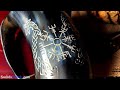 Toast to another successful victory with this immaculate handmade drinking mug. Although this mug works as a nice décor item, it is fully-functional and can be used to hold all kinds of drinkable liquids. This Mug features carvings of both the Midgard Serpent, Jormungandr, and the Icelandic compass-like symbol Vegvisir, which means "That Which Shows the Way". Not only will you know your way through any storm with this mug, but you'll also feel like a true Viking king as you drink from it. The horn is hand-polished for a smooth, shiny look, with a wooden base that is expertly carved to sit evenly on any flat suface. *Please wash with a gentle detergent and polish with vegetable oil to keep it from drying out. And from time to time you will want to use beeswax to coat the inside to keep from cracking and the inside drying out. Do not put hot liquids in this item. Please remember this is a natural item and each piece is unique.